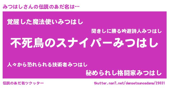| 女子向けラノベタイトル風あだ名 | 『乙女ゲームの破滅フラグしかない悪役みつはしに転生してしまった…』 |