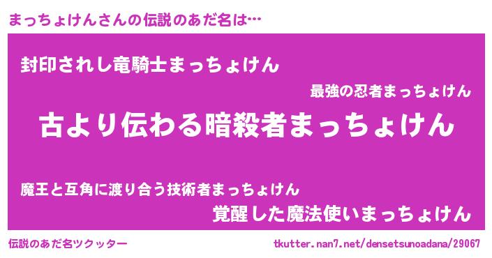 | 男性向けラノベタイトル風あだ名 | 『転生したらまっちょけんだった件』 |
