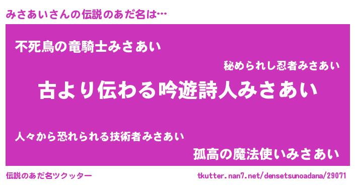 | 男性向けラノベタイトル風あだ名 | 『みさあいという概念が存在しない退屈な世界 』 |