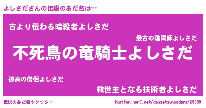 | 男性向けラノベタイトル風あだ名 | 『よしさだの憂鬱』『魔弾の王とよしさだ』 |