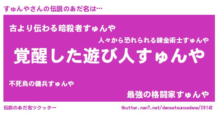| 男性向けラノベタイトル風あだ名 | 『すゅんやに滅ぼされるだけの簡単なお仕事です』 |