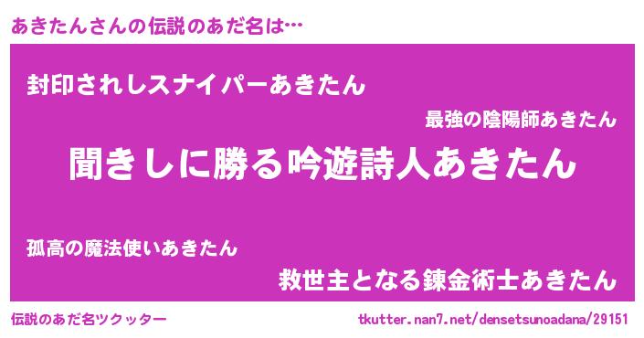 | 意味不明あだ名 | 『自称あきたん』『永久保存あきたん』 |