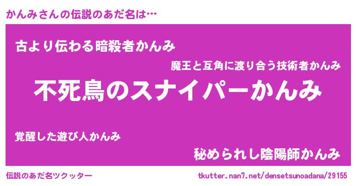 | 女子向けラノベタイトル風あだ名 | 『乙女ゲームの破滅フラグしかない悪役かんみに転生してしまった…』 |