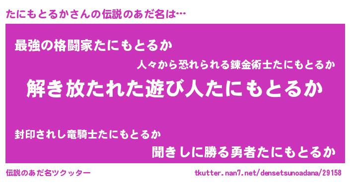 | 男性向けラノベタイトル風あだ名 | 『この素晴らしい世界にたにもとるかを!』 |