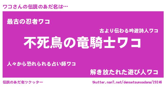 | 女子向けラノベタイトル風あだ名 | 『ワコ姫と円卓の騎士』『ワコ伯爵の花嫁』 |