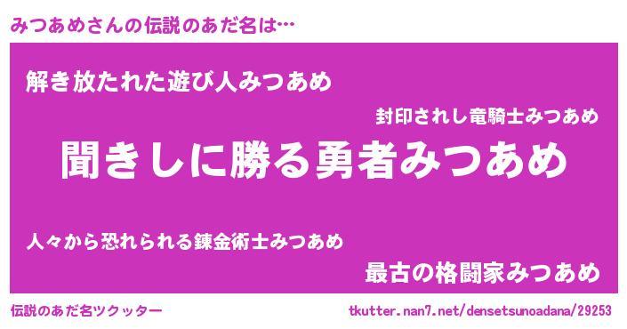 | 意味不明あだ名 | 『永久保存みつあめ』『自称みつあめ』 |
