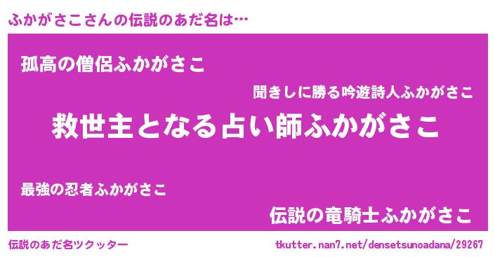 | ヒーロー風カッコイイあだ名 | 『慈愛の使者ふかがさこ』『黄金騎士フカ』 |