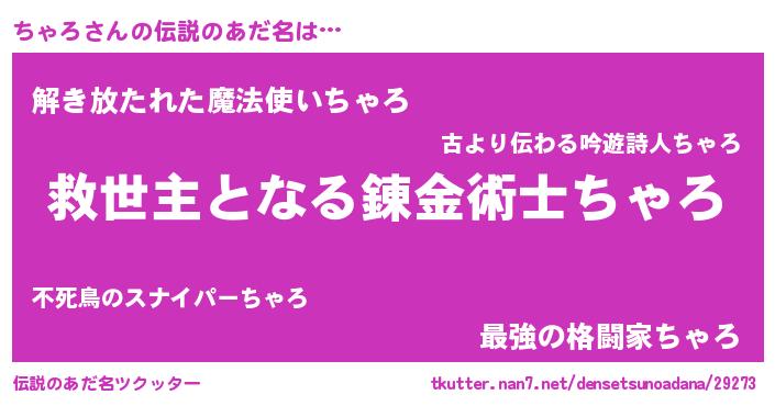 | 男性向けラノベタイトル風あだ名 | 『ちゃろ~年齢イコール彼女いない歴の魔法使い~』 |