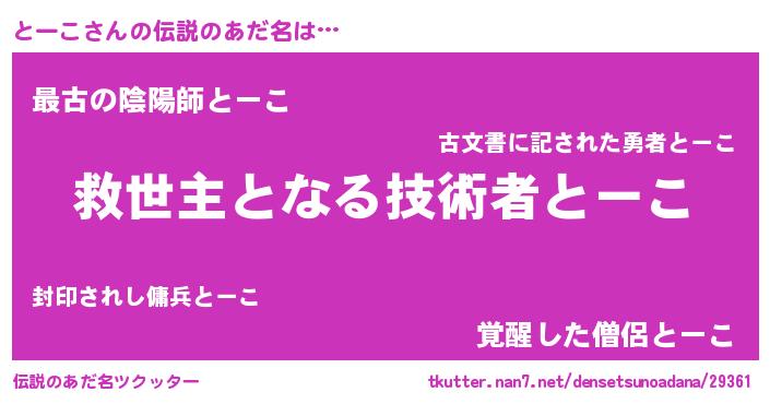 | 意味不明あだ名 | 『自称とーこ』『エリンギ科とーこ属』 |