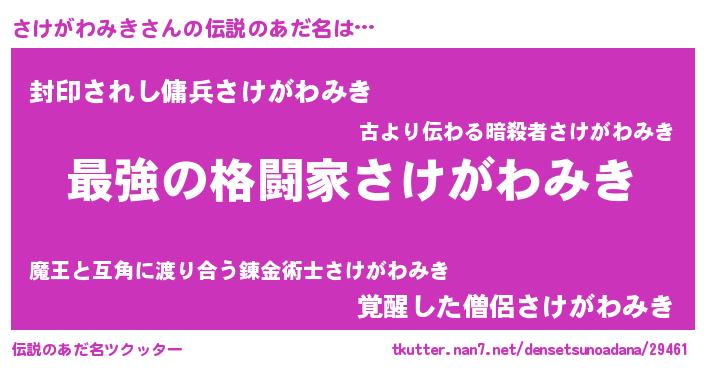 | 男性向けラノベタイトル風あだ名 | 『さけがわみき~年齢イコール彼女いない歴の魔法使い~』 |