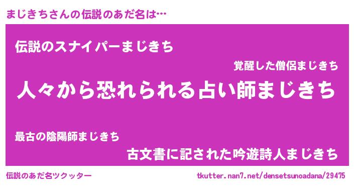 | 男性向けラノベタイトル風あだ名 | 『おまえをオタクにしてやるから、俺をまじきちにしてくれ! 』 |