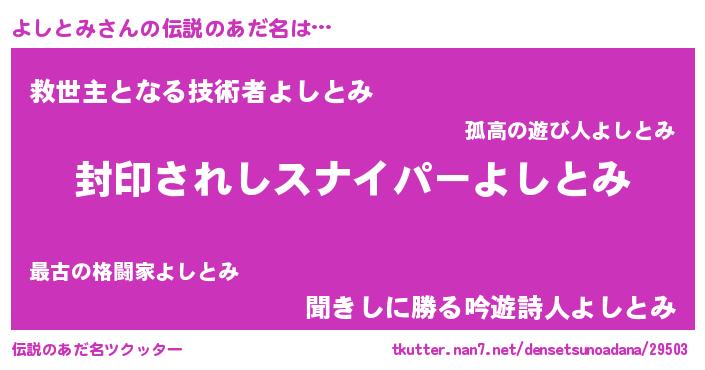 | 男性向けラノベタイトル風あだ名 | 『うちのよしとみが世界を掌握している!』 |