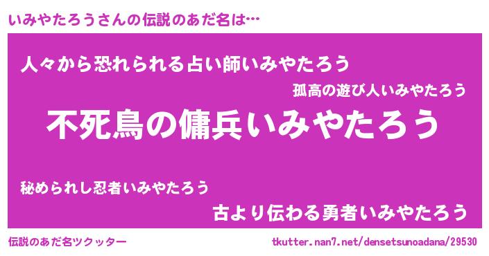 | ヒーロー風カッコイイあだ名 | 『スーパーイミヤタロウ』『魔戒騎士イミ』 |
