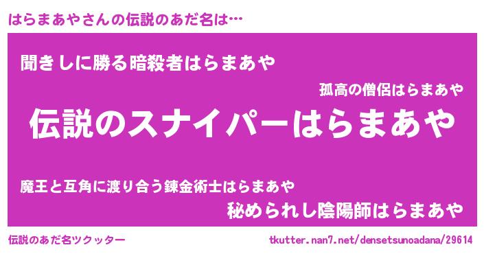 | 男性向けラノベタイトル風あだ名 | 『ハラマアヤスレイヤー』 |