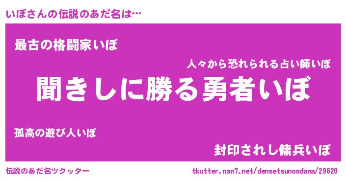 | 男性向けラノベタイトル風あだ名 | 『イボスレイヤー』『魔法科高校のいぼ』 |