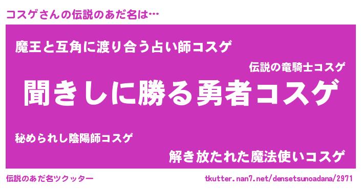 | ヒーロー風カッコイイあだ名 | 『ネオコスゲ』『愛の使者コスゲ』 |