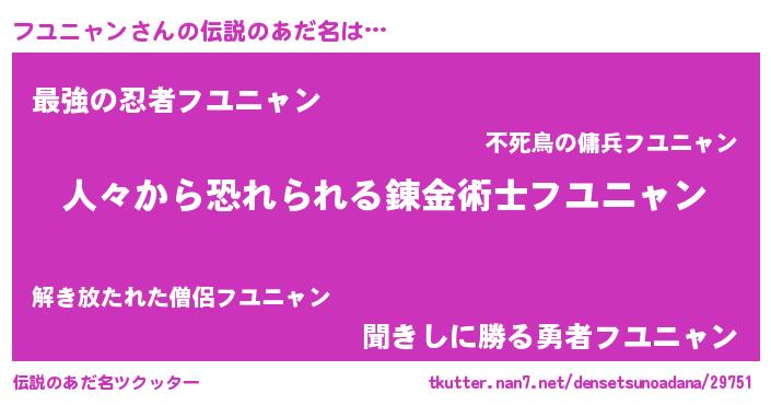 | 男性向けラノベタイトル風あだ名 | 『おまえをオタクにしてやるから、俺をフユニャンにしてくれ! 』 |