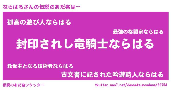 | ヒーロー風カッコイイあだ名 | 『スーパーナラハル』『天弓騎士ナラ』 |