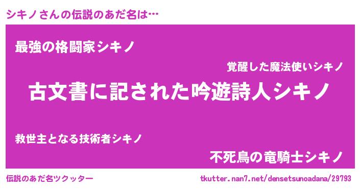 | 男性向けラノベタイトル風あだ名 | 『シキノに滅ぼされるだけの簡単なお仕事です』 |