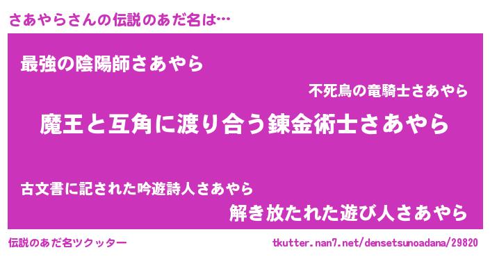 | ヒーロー風カッコイイあだ名 | 『仮面サアダー』『慈愛の使者さあやら』 |