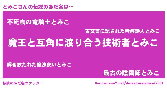 | 女子向けラノベタイトル風あだ名 | 『とみこ恋絵巻』『とみこ姫と円卓の騎士』 |