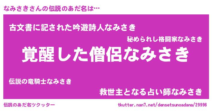 | 男性向けラノベタイトル風あだ名 | 『なみさきの嫁は女の子じゃないと思った?』 |