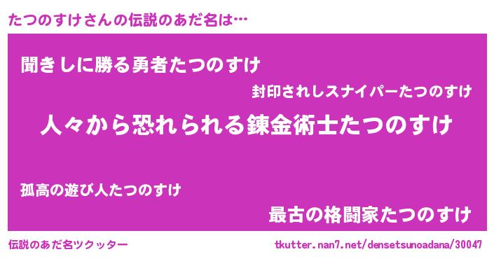 | 男性向けラノベタイトル風あだ名 | 『おまえをオタクにしてやるから、俺をたつのすけにしてくれ! 』 |