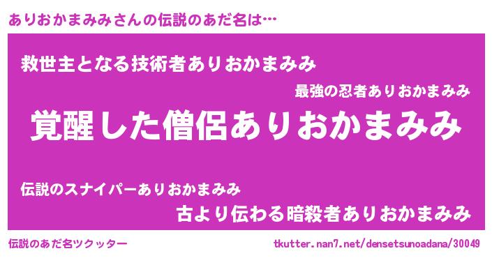 | 胡散臭い通販商品みたいなあだ名 | 『あなたにだけ特別に提供する限定10本のレアな日本酒…その名も「ありおかまみみ」』 |