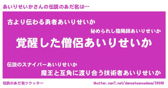 | 胡散臭い通販商品みたいなあだ名 | 『あなたにだけ特別に提供する限定10本のレアな日本酒…その名も「あいりせいか」』 |
