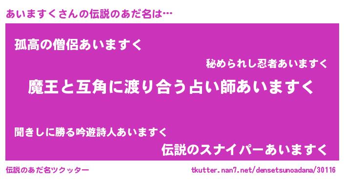 | 男性向けラノベタイトル風あだ名 | 『魔弾の王とあいますく』 |