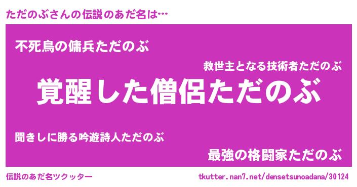 | 男性向けラノベタイトル風あだ名 | 『ただのぶ~年齢イコール彼女いない歴の魔法使い~』 |
