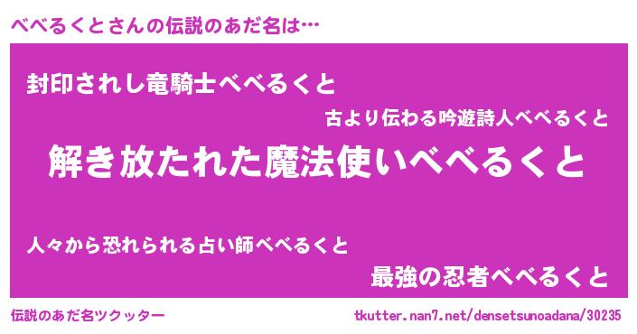 | 胡散臭い通販商品みたいなあだ名 | 『伝統あるサプリメント…その名も「べべるくと」』 |