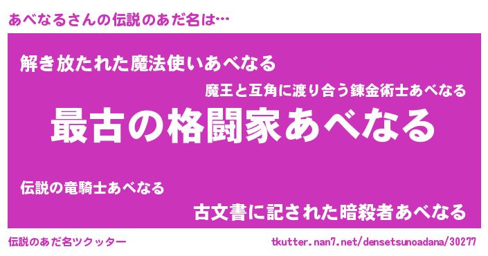 | ヒーロー風カッコイイあだ名 | 『ウルトラあべなるマン』『魔戒騎士アベ』 |