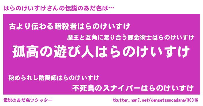 | 女子向けラノベタイトル風あだ名 | 『はらのけいすけは平凡を望む』 |