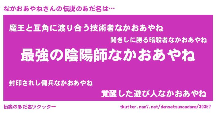 | 男性向けラノベタイトル風あだ名 | 『この素晴らしい世界になかおあやねを!』 |