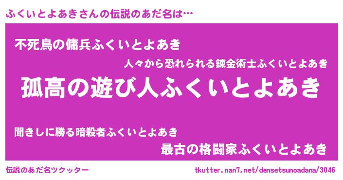 | 男性向けラノベタイトル風あだ名 | 『魔弾の王とふくいとよあき』 |