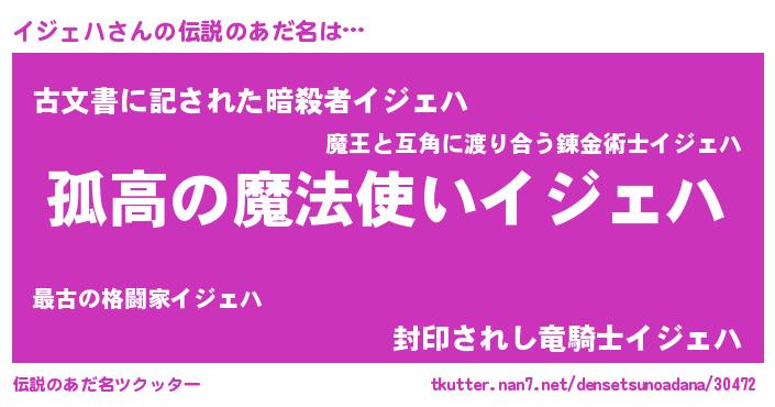 | 男性向けラノベタイトル風あだ名 | 『イジェハスレイヤー』『緋弾のイジェハ』 |