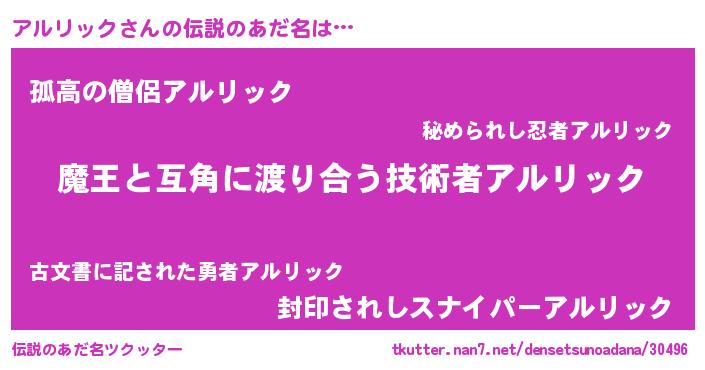 | ヒーロー風カッコイイあだ名 | 『慈愛の使者アルリック』『暗黒騎士アル』 |