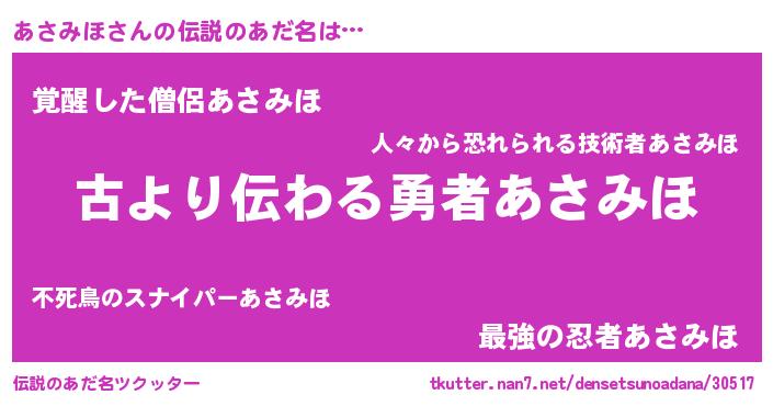 | 胡散臭い通販商品みたいなあだ名 | 『来世でも幸せになれる水素水…その名も「あさみほ」』 |