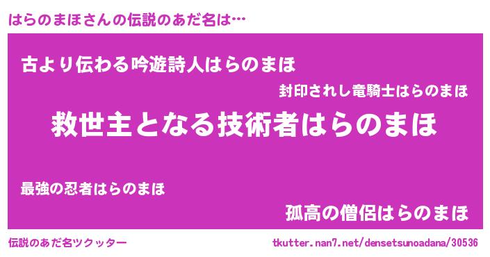 | 男性向けラノベタイトル風あだ名 | 『はらのまほに滅ぼされるだけの簡単なお仕事です』 |