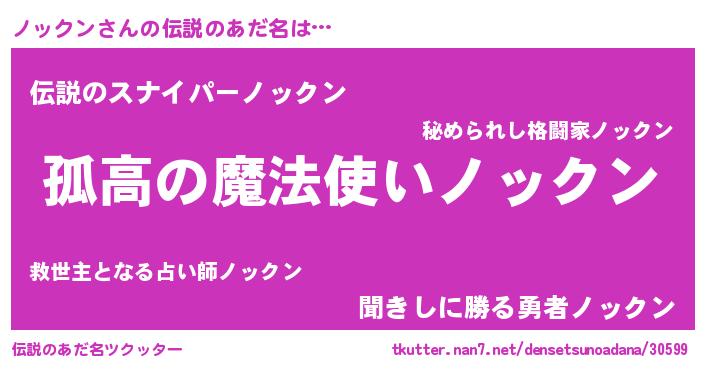 | 男性向けラノベタイトル風あだ名 | 『魔弾の王とノックン』 |