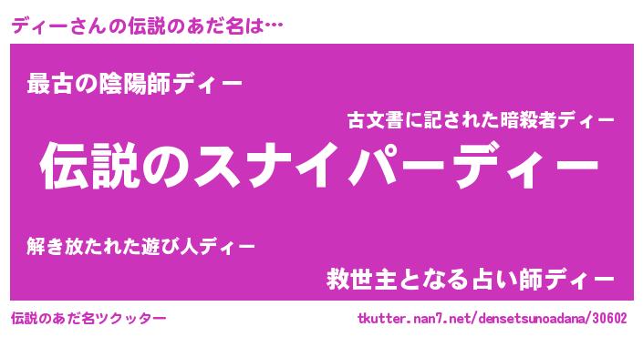 | 男性向けラノベタイトル風あだ名 | 『ディースレイヤー』『魔弾の王とディー』 |