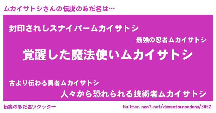 | 男性向けラノベタイトル風あだ名 | 『この素晴らしい世界にムカイサトシを!』 |