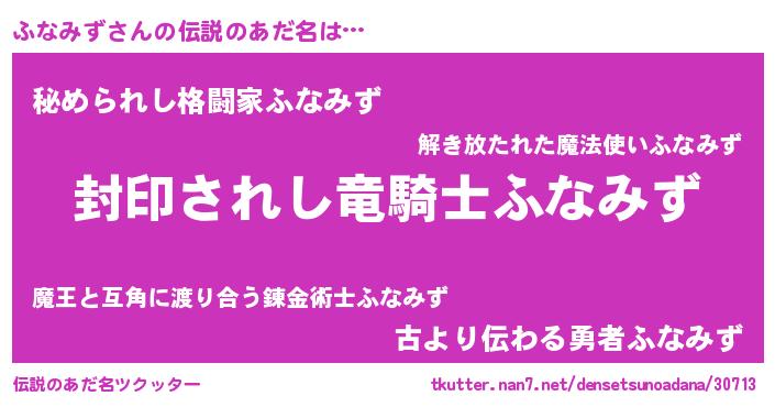 | 男性向けラノベタイトル風あだ名 | 『フナミズアートオンライン』 |