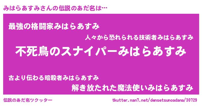 | 女子向けラノベタイトル風あだ名 | 『みはらあすみ姫と円卓の騎士』 |
