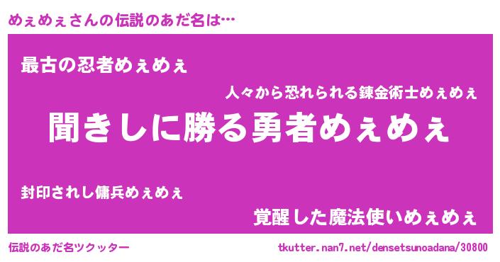 | 男性向けラノベタイトル風あだ名 | 『めぇめぇという概念が存在しない退屈な世界 』 |