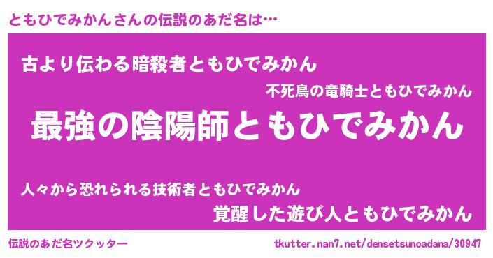 | 男性向けラノベタイトル風あだ名 | 『ともひでみかんに滅ぼされるだけの簡単なお仕事です』 |
