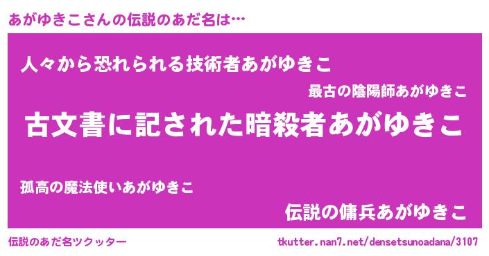 | ヘコむあだ名 | 『あがゆきこ(笑)』『あがにー』 |