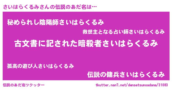 | 意味不明あだ名 | 『自称さいはらくるみ』 |