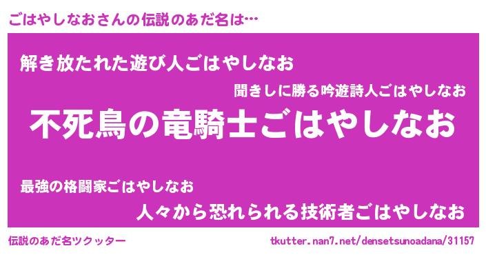 | ポケモン風あだ名 | 『ゴハチュウ』『ヒゴハヤシナオ』 |